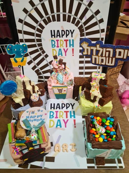 עוגת שוקולד בצורת רכבת, בציפוי קצפת משובחת ומלאה בממתקים.